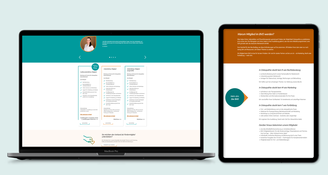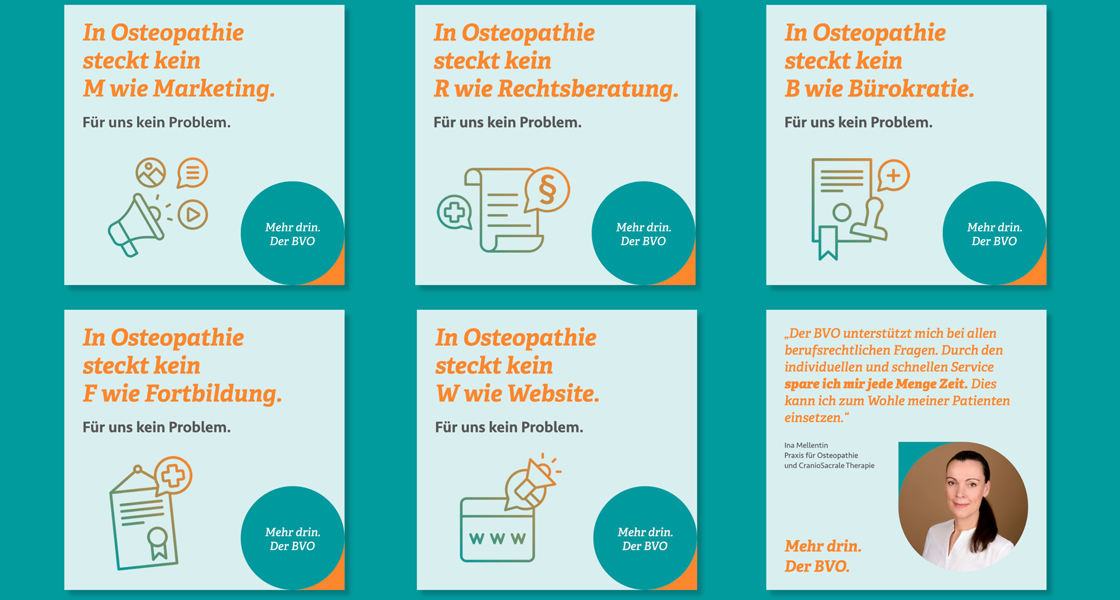 Der Bundesverband Osteopathie e.V. (BVO) ist einer der größten Verbände für Osteopath*innen in Deutschland. Seinen Mitgliedern bietet er neben umfassenden Leistungen vor allem eins: Zeit- und Kostenersparnis im beruflichen Alltag. Unsere Kampagne zur Mitgliedergewinnung arbeitet diesen Punkt heraus und schafft Identifikation für zukünftige und bestehende Mitglieder.