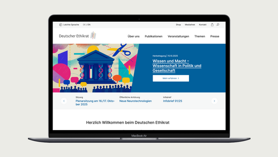 Die Website im gradlinigen Design bündelt anschaulich den gesellschaftsrelevanten Content des Deutschen Ethikrats. Eine Mediathek mit Warenkorbfunktion erleichtert den Zugang zu vielfältigen Publikation für Interessierte und Journalist*innen.