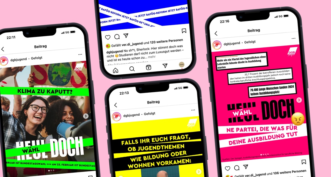 Die Kampagne solidarisiert sich mit jungen Menschen und spricht über die für sie relevanten Themen wie bezahlbarer Wohnraum, Perspektiven für Ausbildung oder Mindestlohn. Für die Bundestagswahl wurde ein „Wahlcheck veröffentlicht, der die wichtigsten Themen der Gewerkschaftsjugend mit den Wahlprogrammen der Parteien abgleicht. Hier zeigt sich: Wer setzt sich wirklich für die Themen ein, die mir wichtig sind?