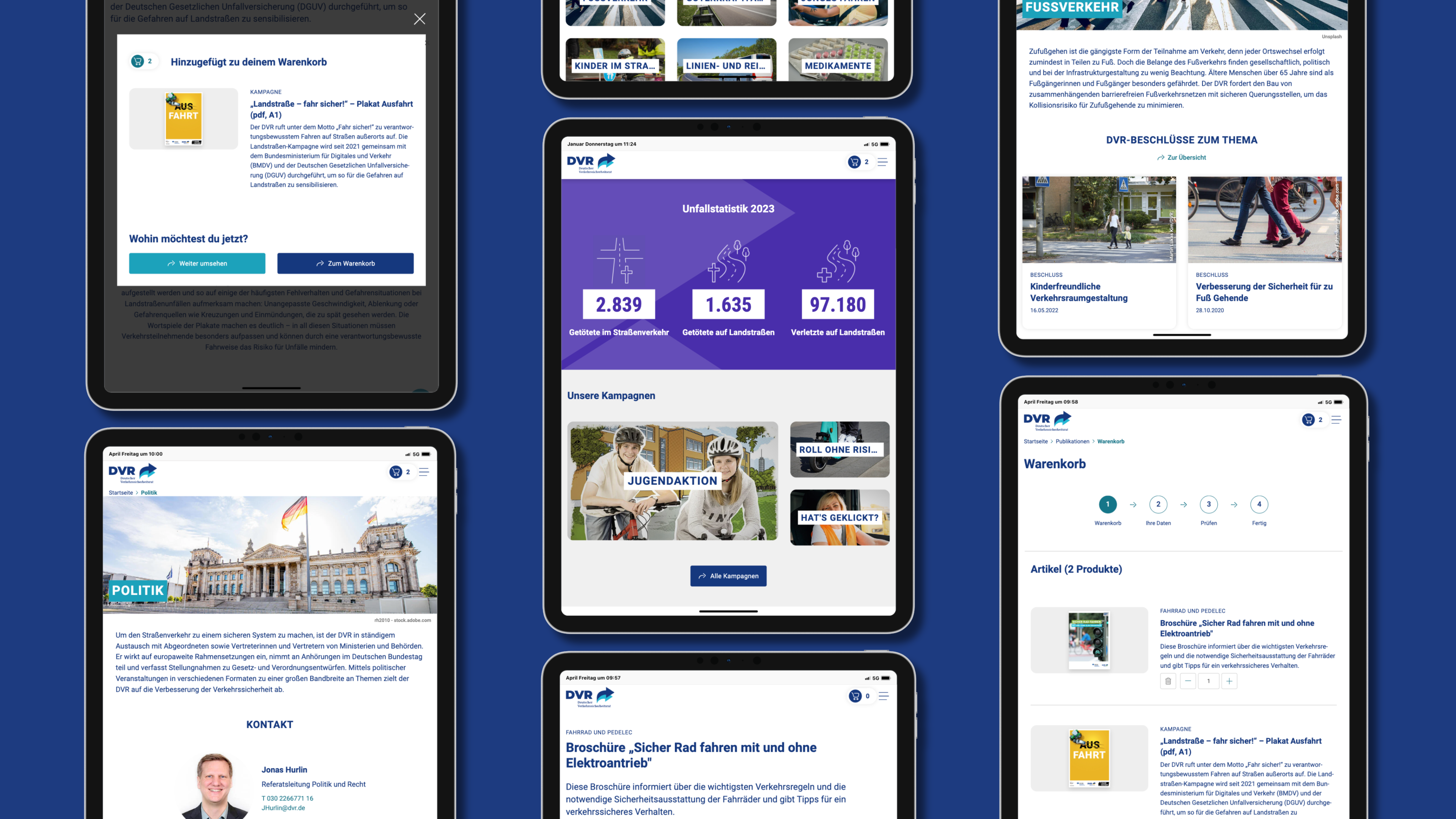 Zu den vielen Zielgruppen, die der DVR anspricht, zählen vor allem politische Akteur*innen, die Presse, aber auch Lehrpersonal und Arbeitgebende, die Menschen im Kontext des Straßenverkehrs beschäftigen. Ihnen bietet der DVR zahlreiche Informationen zu Themen der Verkehrssicherheit. Doch nicht nur online liefert der DVR wertvolles Wissen. Auch können Besucher*innen aus digitalen und Print-Publikationen zu einer breiten Palette an Themen wählen. Diese können im Shop heruntergeladen oder kostenfrei bestellt werden. Um diese noch einfacher zugänglich zu machen, haben wir die Shopfunktion der Seite vereinfacht und um einen Warenkorb ergänzt.