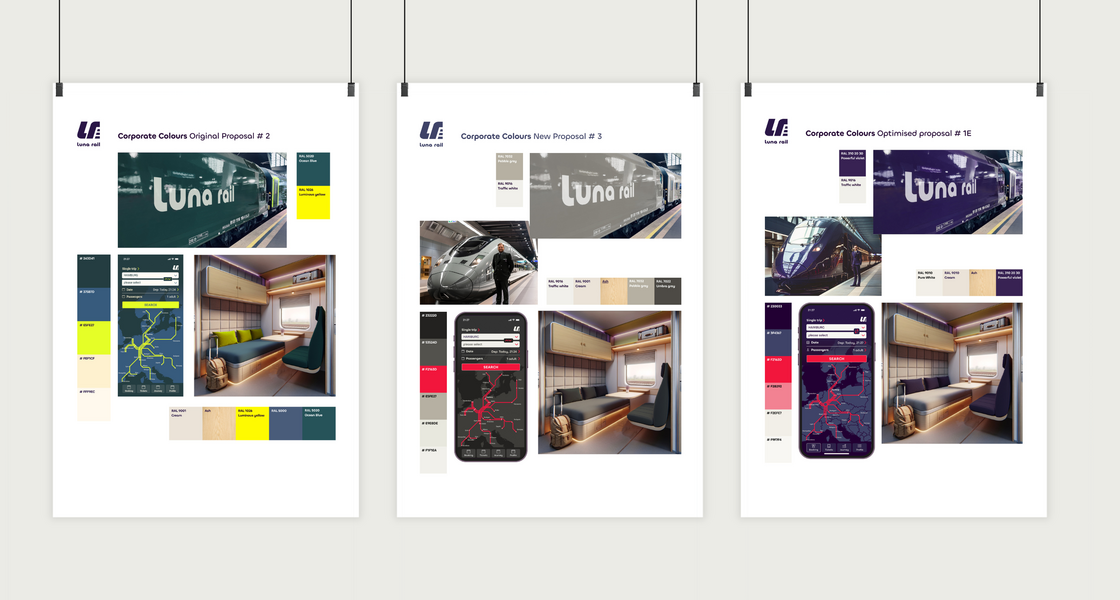 Luna Rail entschied sich hierbei auch aufgrund von Vorerfahrungen bei der Beratung von European Sleeper für wegewerk. Wie die gewünschte Positionierung visuell erlebbar wird, haben wir zunächst anhand einer umfangreiche Umfeldanalyse in gemeinsamen Workshops herausgearbeitet. Für die Prüfung der Farbwirkung wurden Innen- und Außenansichten beispielhafter Fahrzeuge unter Nutzung von KI generiertem Bildmaterial zu Moodboards verarbeitet, da die Renderings selbst erst später auf dieser Basis entstehen sollten.