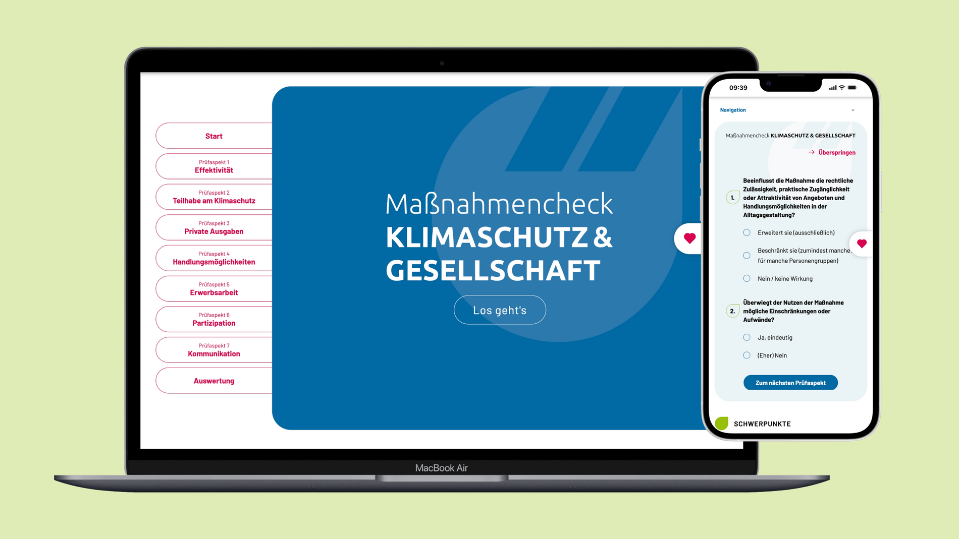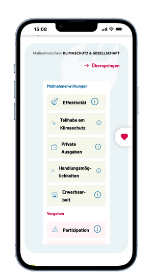 Das Tool untersucht zentrale Faktoren, die für die Akzeptanz von Klimaschutzmaßnahmen, das Gerechtigkeitsempfinden und die Motivation zum Mitmachen wichtig sind. Nutzer*innen beantworten dazu kurze Multiple-Choice-Fragen und erhalten nach jeder Antwort eine verständliche Einordnung der möglichen gesellschaftlichen Auswirkungen. Am Ende fasst das Tool die Ergebnisse zusammen und gibt Empfehlungen, wie Stärken ausgebaut und Schwächen verbessert werden können. Dabei geht es nicht um richtige oder falsche Antworten, sondern um eine bewusste und reflektierte Gestaltung von Maßnahmen.
