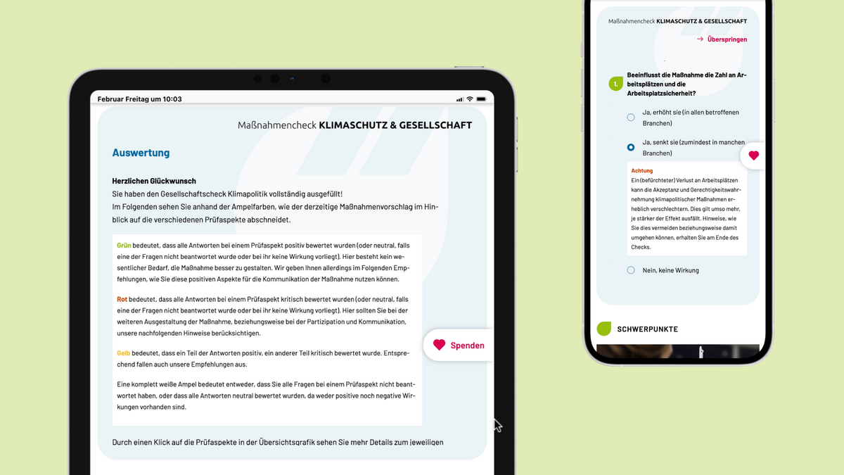 Für das Öko-Institut haben wir den Gesellschaftscheck Klimapolitik umgesetzt, ein interaktives TYPO3-Modul, das Akteur*innen unterstützt, Klima- und Umweltmaßnahmen bereits in der Konzeptionsphase auf gesellschaftliche Akzeptanz, Gerechtigkeit und Motivation zu prüfen. Anders als klassische Bewertungsinstrumente ist das Tool nicht vornehmlich für den Vergleich fertiger Maßnahmen vorgesehen, sondern bietet Orientierung, während Vorschläge noch entwickelt werden. So können gesellschaftliche Faktoren von Beginn an berücksichtigt werden.
