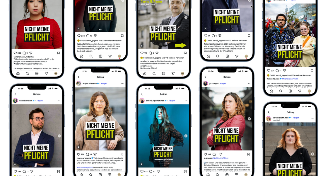 Als im November 2025 im Bundestag die Wiedereinführung der Wehrpflicht diskutiert wurde, war das Thema medial allgegenwärtig. Auch unsere Kundin ver.di Jugend wollte sich dazu positionieren und ihrer Haltung gegen Pflichtdienste jeglicher Art Ausdruck verleihen. Dafür war eine Social Media Challenge rund um den Zeitpunkt der Bundestagslesung geplant und vorbereitet. Am Morgen der Veröffentlichung stellten wir jedoch fest: Die ursprüngliche Idee war nicht intuitiv genug, nicht schnell genug umsetzbar für Instagram und barg das Risiko ins Leere zu laufen.