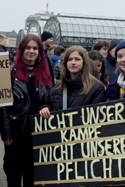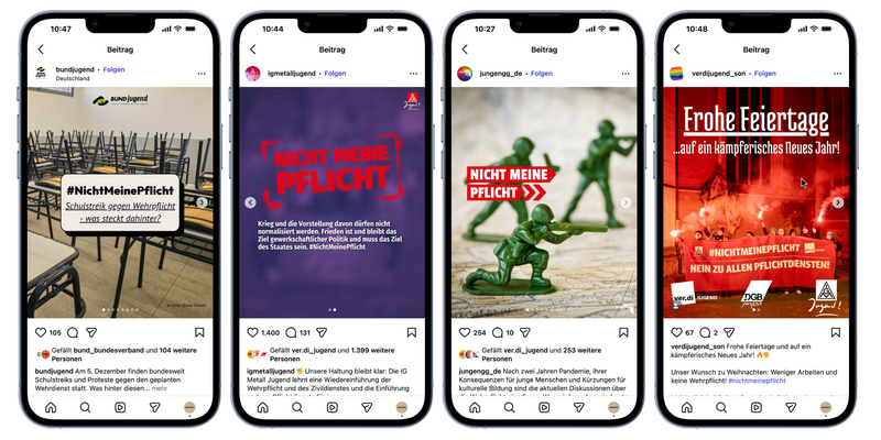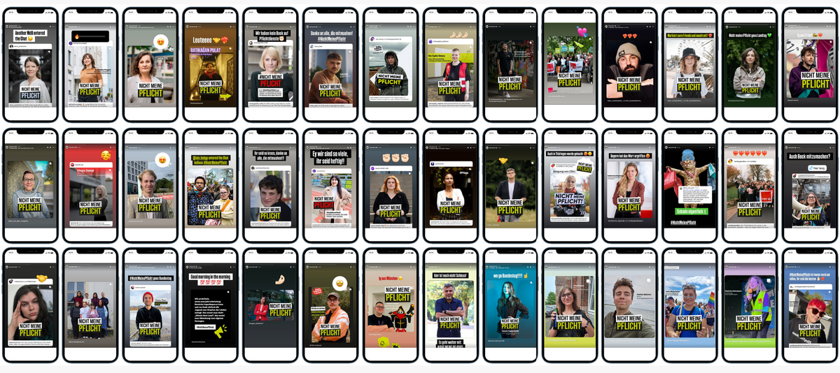 Zusätzlich griffen Content Creator*innen den Claim auf und verstärkten die Reichweite. Der Claim schaffte den Sprung von der online- in die offline-Welt: Aus dem digitalen Protest entstanden Demoplakate für Demonstrationen gegen die Wehrpflicht – ein klarer Beweis für die Anschlussfähigkeit der Kampagne.