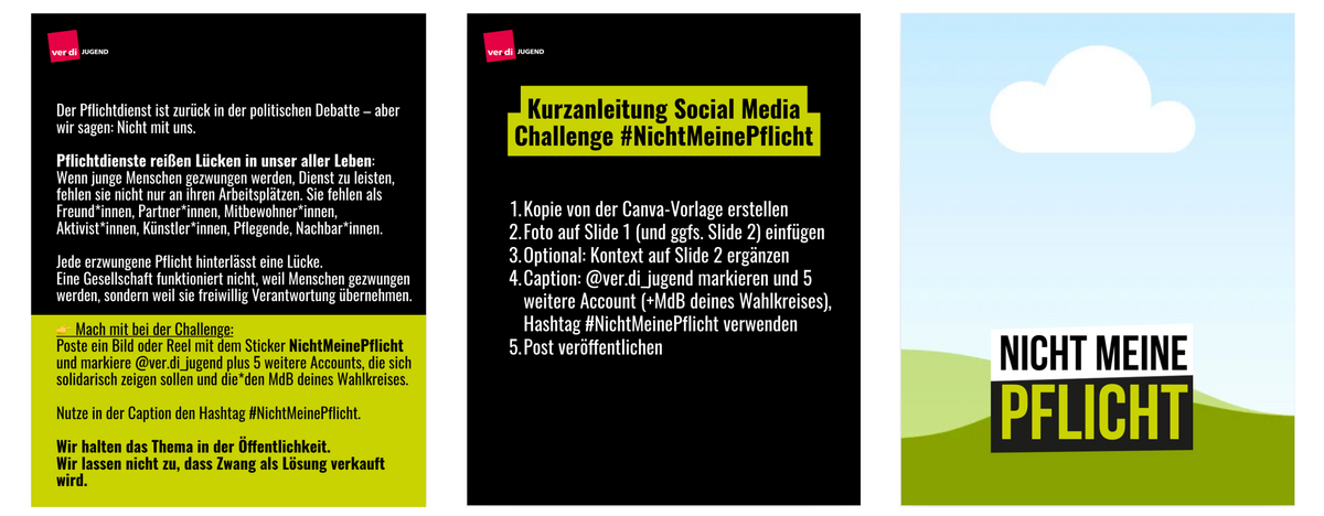 Innerhalb einer Stunde entwickelten wir einen neuen Ansatz - denn Geschwindigkeit war hier der entscheidende Faktor. Der neue Claim #NichtMeinePflicht bringt die Haltung der ver.di Jugend auf den Punkt. Er steht für eine persönliche, selbstbestimmte Haltung in einer hochpolitischen Debatte. Der Claim richtet sich nicht pauschal gegen einen Wehrdienst, sondern gegen eine Verpflichtung, die individuelle Lebensentwürfe und soziale Realitäten ausblendet. Denn für die ver.di Jugend ist klar: „Pflichtdienste reißen Lücken in das Leben junger Menschen und junge Menschen aus ihrem Umfeld.“
